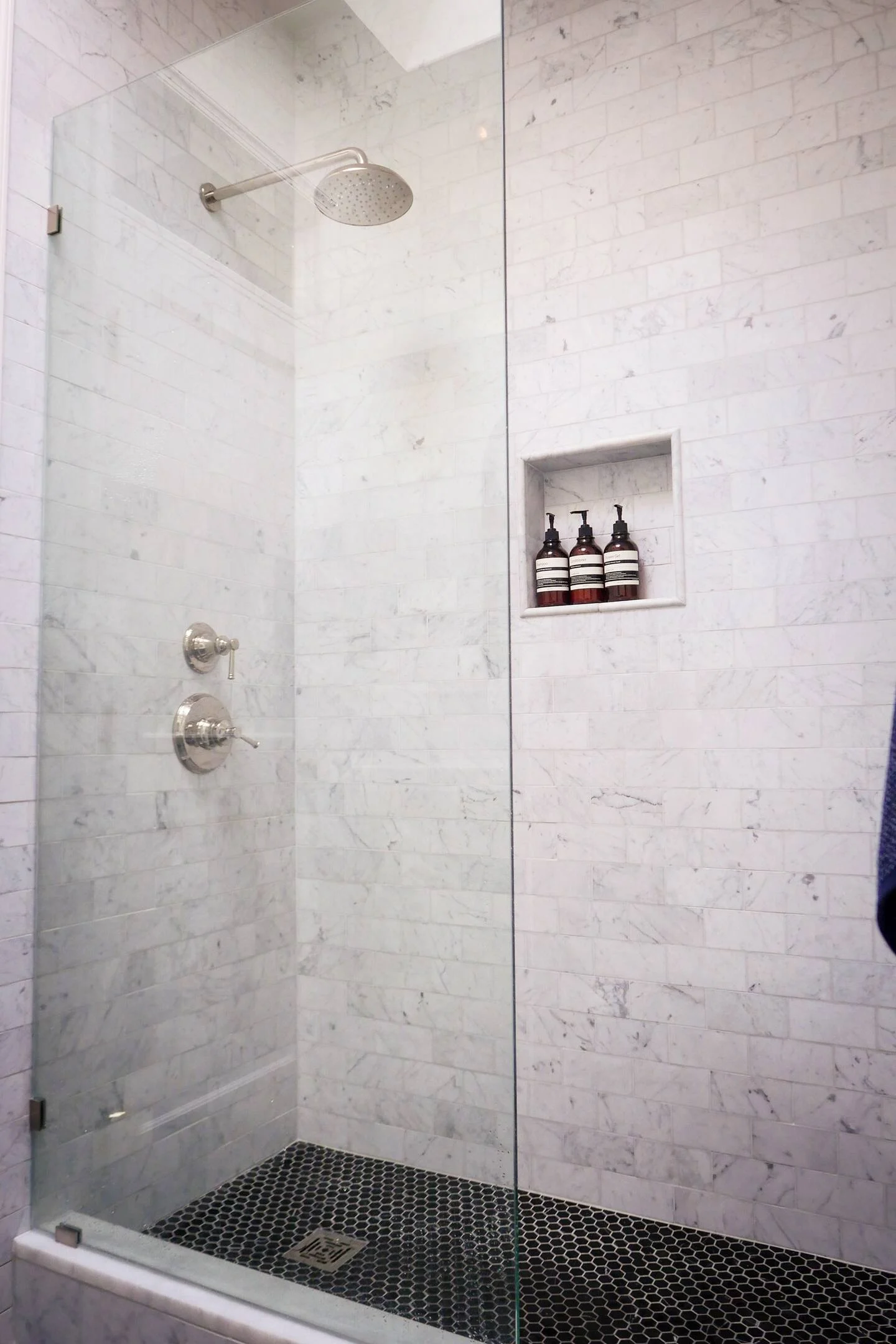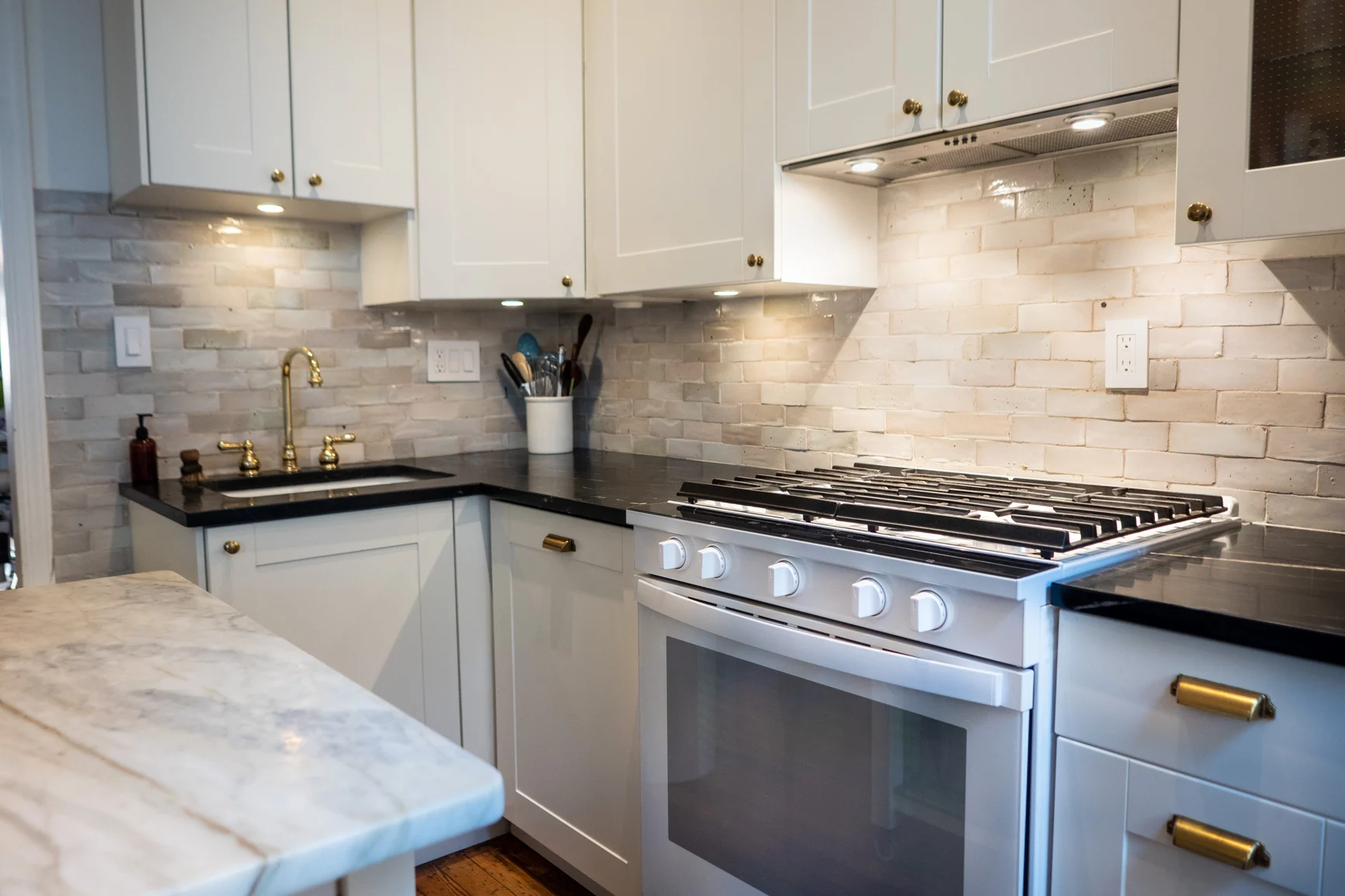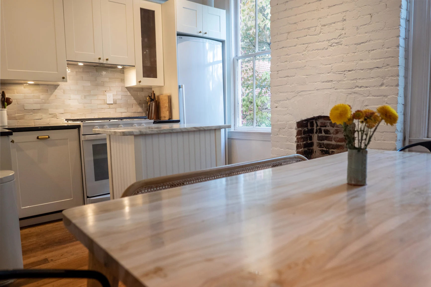 The kitchen has modern appliances and tasteful design – soapstone counters and handmade subway tile backsplash. The large dining table can easily seat six, with four chairs and a bench.