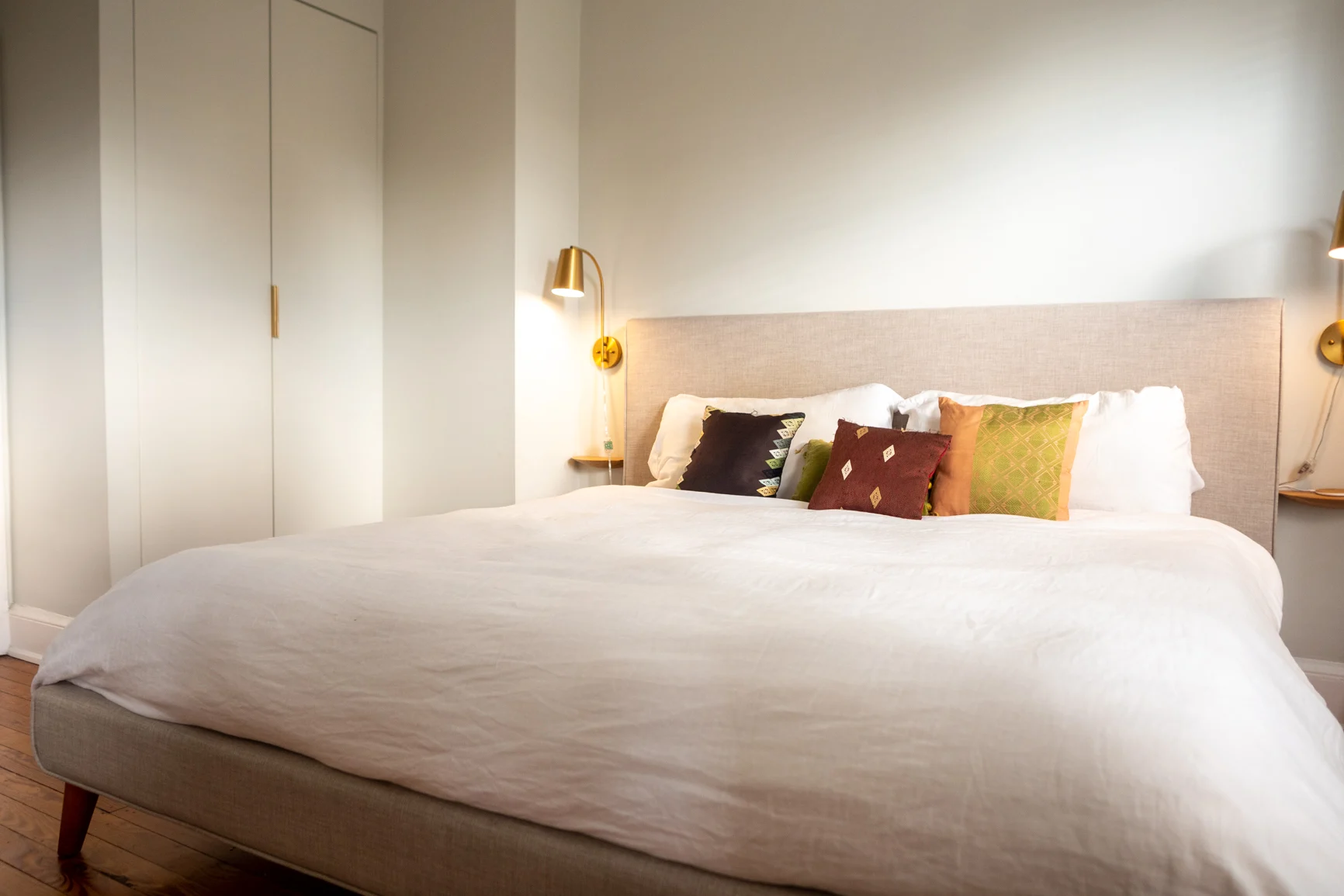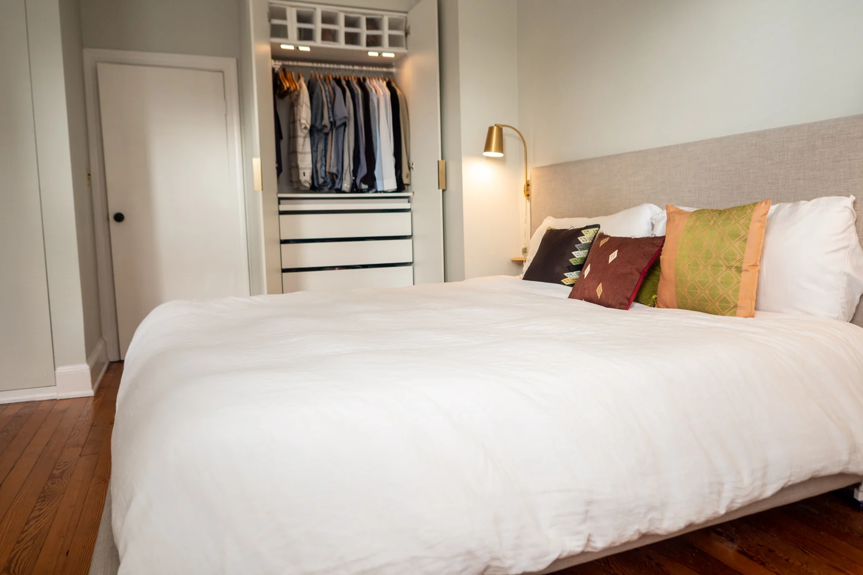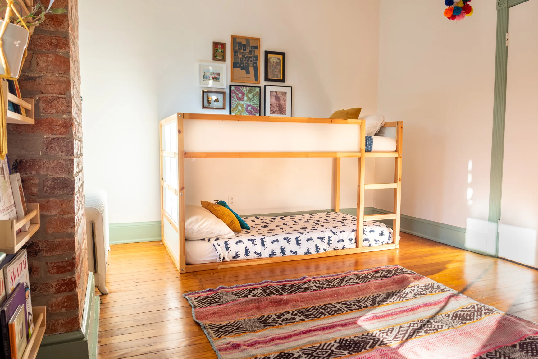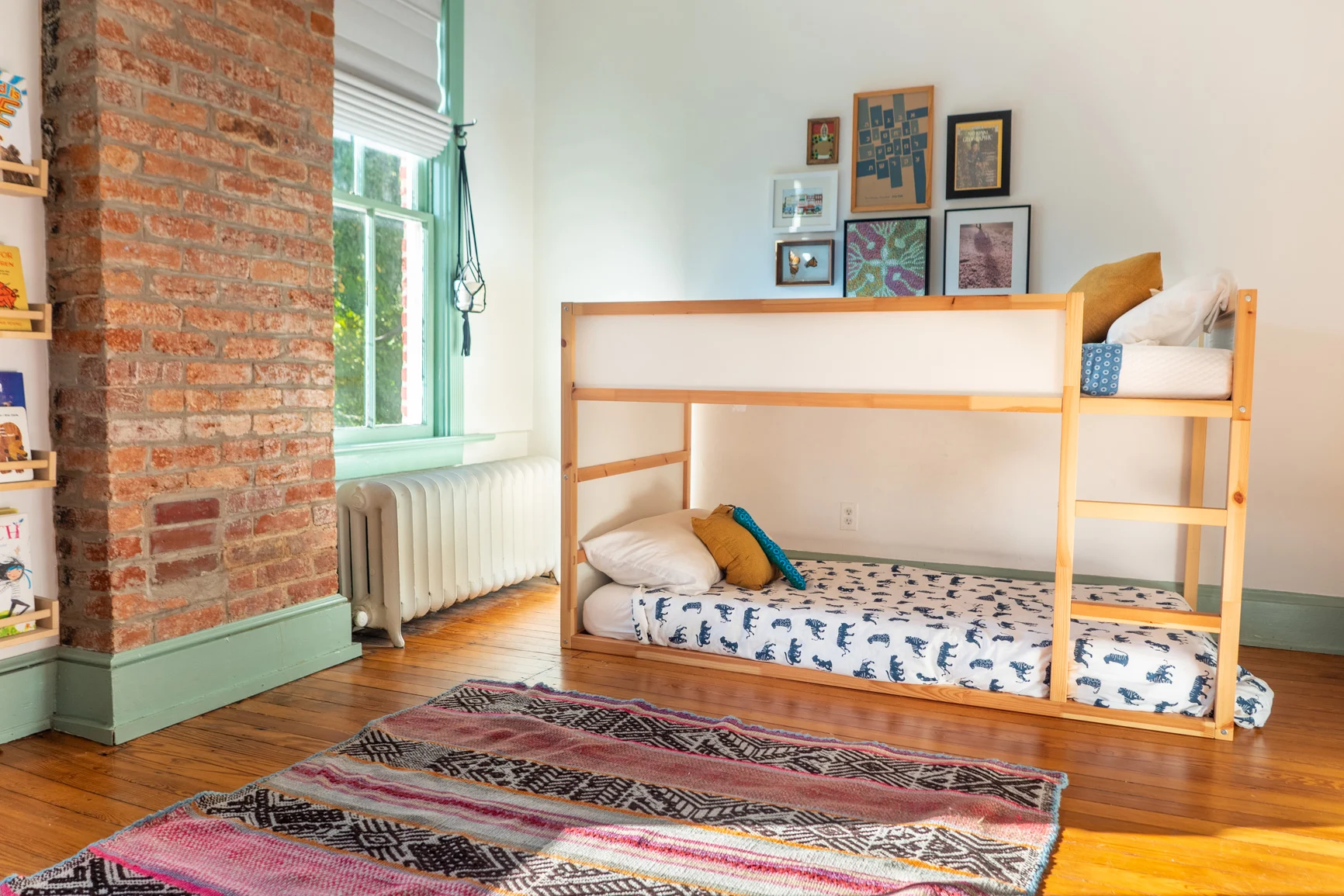 The main bedroom features a king bed, two large closets and four tall bay windows that fill the space with light in the morning. The second bedroom has a bunk bed with super comfy mattresses perfect for the little ones, and two large windows. Kids can enjoy the “Nugget” couch for play or lounging. And there’s plenty of storage in the large custom closet opposite the windows.