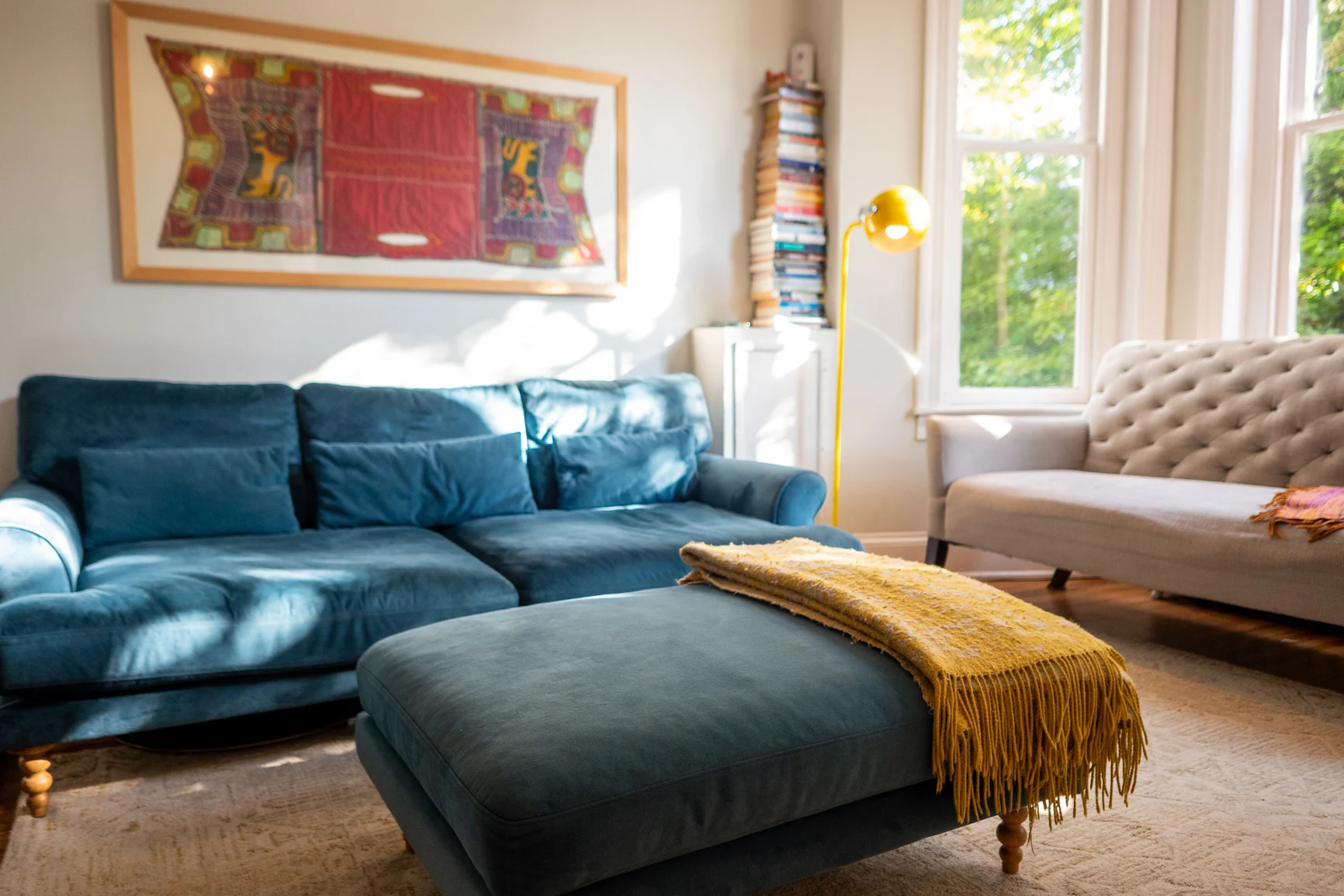 The living area has plenty of seating, a large 50″ smart TV with Sonos speaker, and three large bay windows with lots of light.